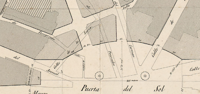 | Recorte de la fotografía: Charles Clifford (1857). Fuente: B.N.E. (1) Taller de "Litografía de los Mineros". Así era la antigua Puerta del Sol. |