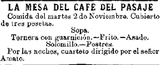 Su dueño, el Sr. Montenegro, dio al negocio del café del Pasaje una nueva perspectiva estableciendo los menús de 3 pesetas, que cada día serían diferentes y anunciados en la prensa. Todas las noches un cuarteto musical amenizaba la velada, con el prestigioso violinista Sr. Amato.