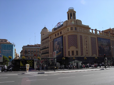Aspecto actual de la plaza del Callao. El café estaba situado, aproximadamente, en donde se encuentra la mediana de la calzada.