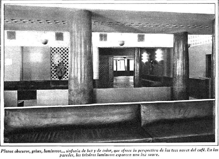 Su decoración sencilla y funcional había cambiado los divanes de los viejos cafés por tresillos y sillones con tapicería de dibujos geométricos simples, acompañados de mesas bajas con estructura metálica. Una barra semicircular, con taburetes altos, encajada en una bóveda de cuarto de esfera y una gran viga en forma de palmera, completaban la ornamentación del recinto en el que se podían degustar sus famosos cócteles.