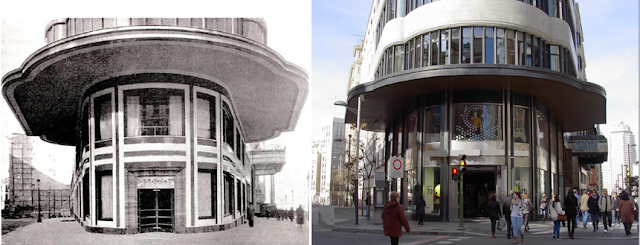 Fachada del edificio del arquitecto Luis Díaz de Tolosa, construido en el año 1928, donde estuvo el café Iruña. Tal vez el mejor representante del Art Decó de la Gran Vía de Madrid. |