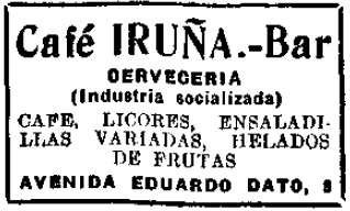 El café Iruña bar fue inaugurado en el año 1932 y se encontraba situado en la esquina de la avenida Eduardo Dato, número 8 (actual Gran Vía, 52) con la calle de Silva, número 11.