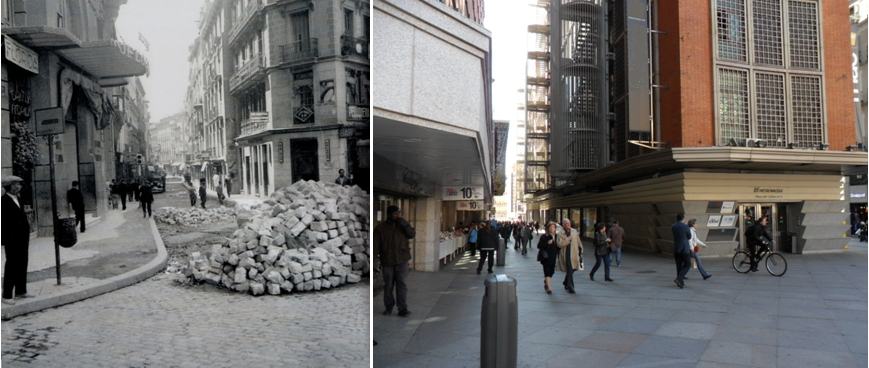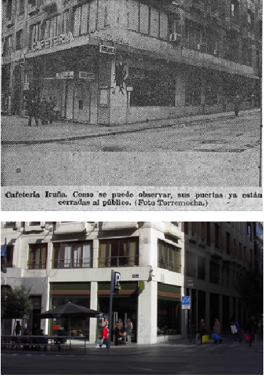 Esquina del edificio Carrión. A la izquierda el bar Capitol, que luego sería la cafetería Manila. A la derecha el local en la actualidad. |